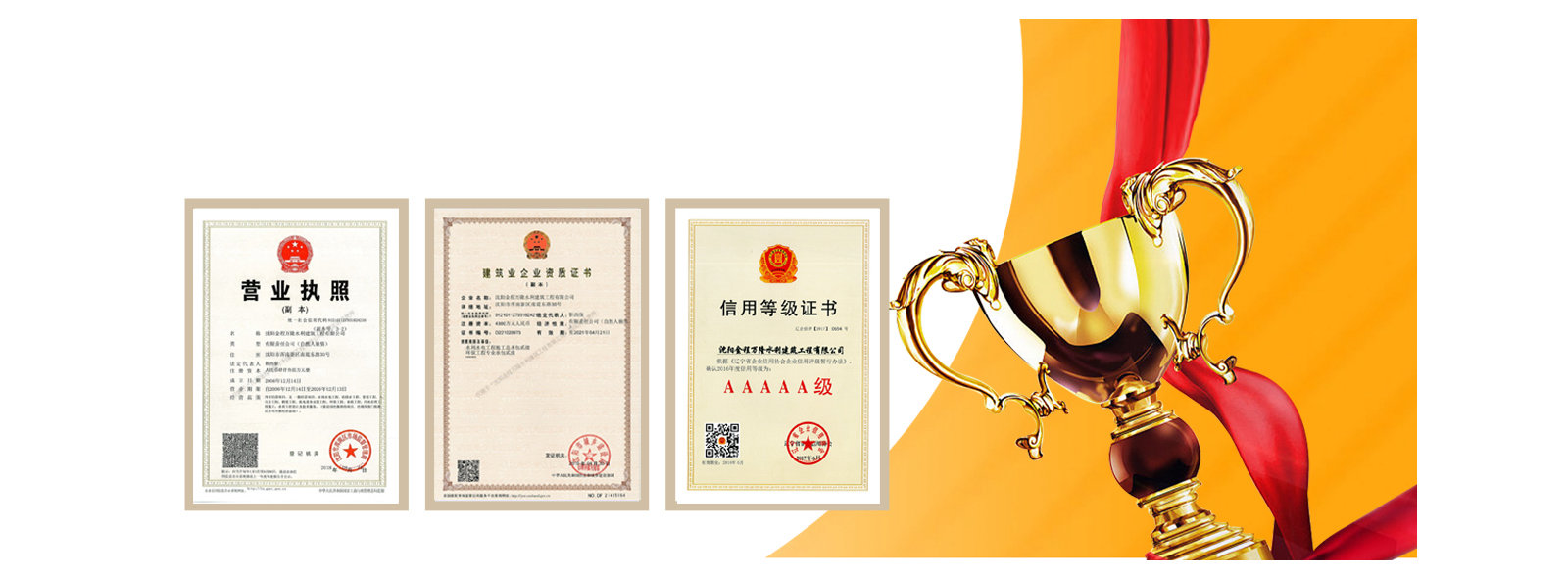 我公司先后受到遼寧省建筑業(yè)協(xié)會的好評,遼寧省及沈陽市工商局頒發(fā)的重合同守信譽企業(yè)稱號,勞動保障監(jiān)察書面誠信等級A,信用遼寧網站公示AAA等級,信用沈陽網站公示AAA等級,水利安全生產標準化二級單位,中國水利工程協(xié)會信用AAA等級,